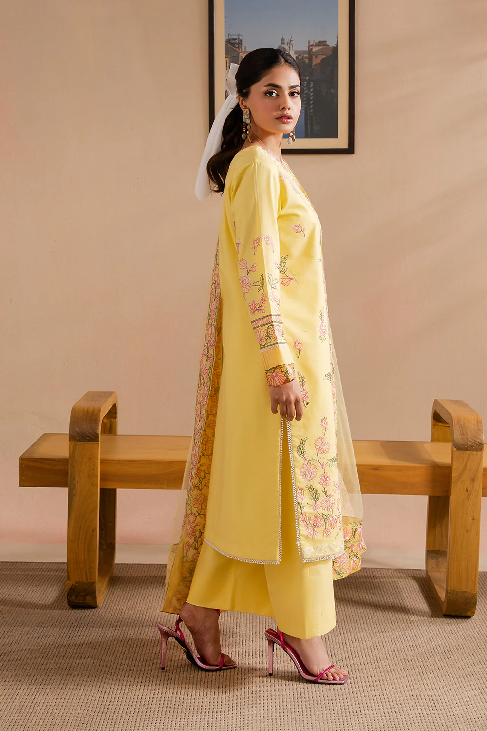 Brighten up your look with this radiant 3-piece ensemble in Sun Shine. The Lawn and Organza shirt exudes elegance, paired with a tailored Cotton trouser, while the delicate Net dupatta adds a touch of sheer grace.